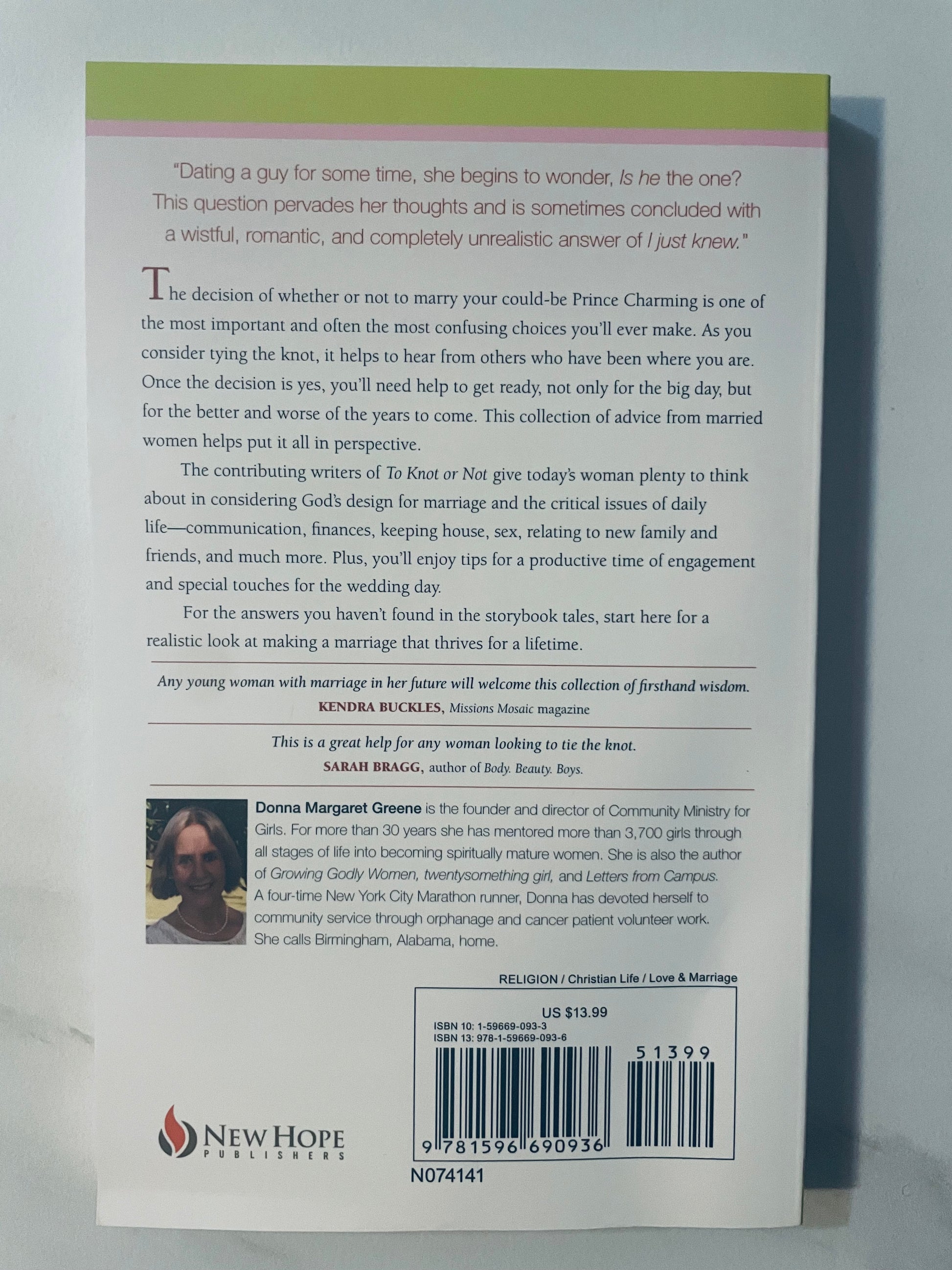 Donna Margaret Greene's To Knot or Not, a collection of advice letters from 70 young Christian women all over the United States, allows readers to glean honest advice about premarital issues such as dating to marry, what it means to marry God's way, and steps to take to lay the proper foundation for marriage.