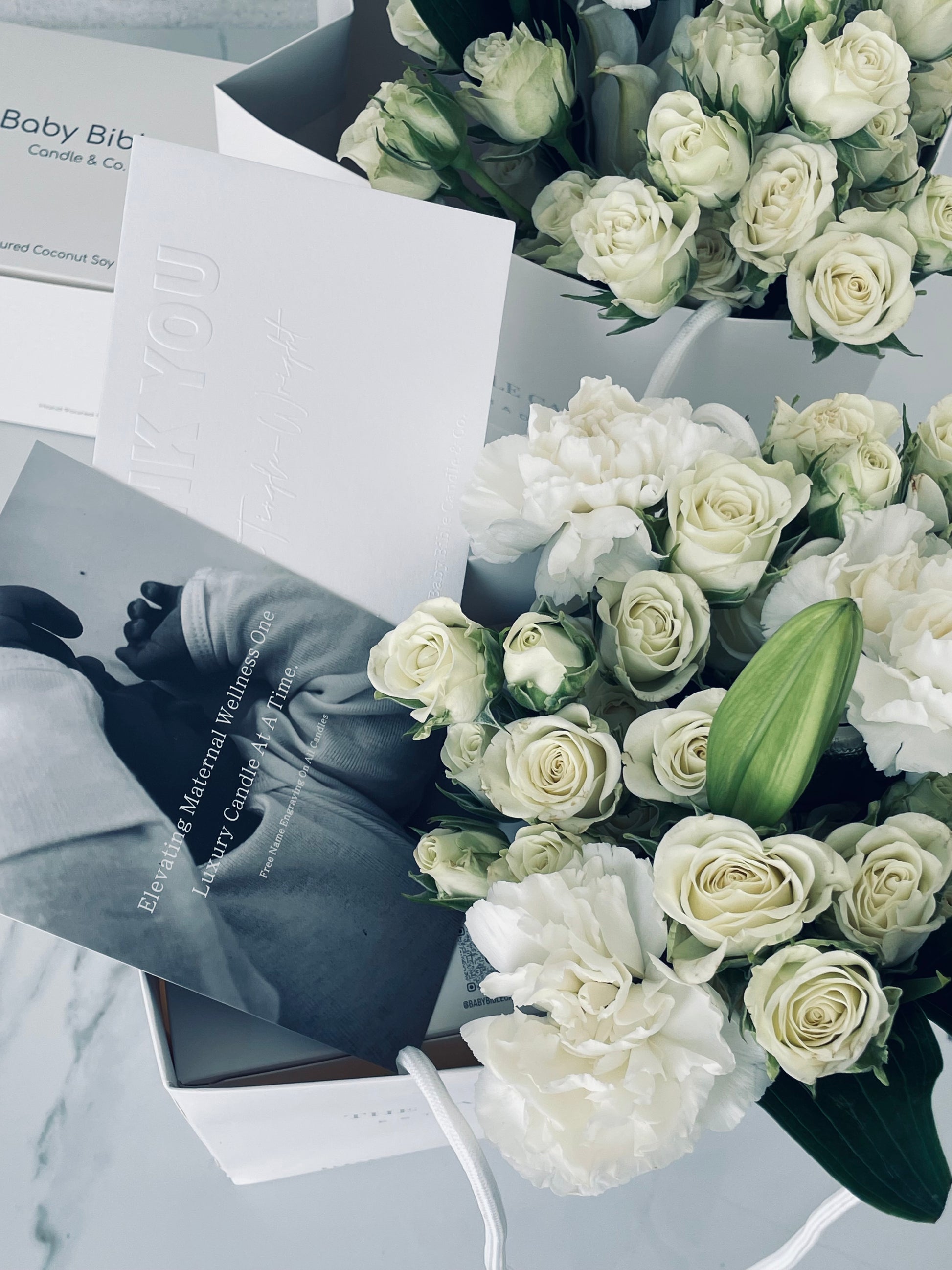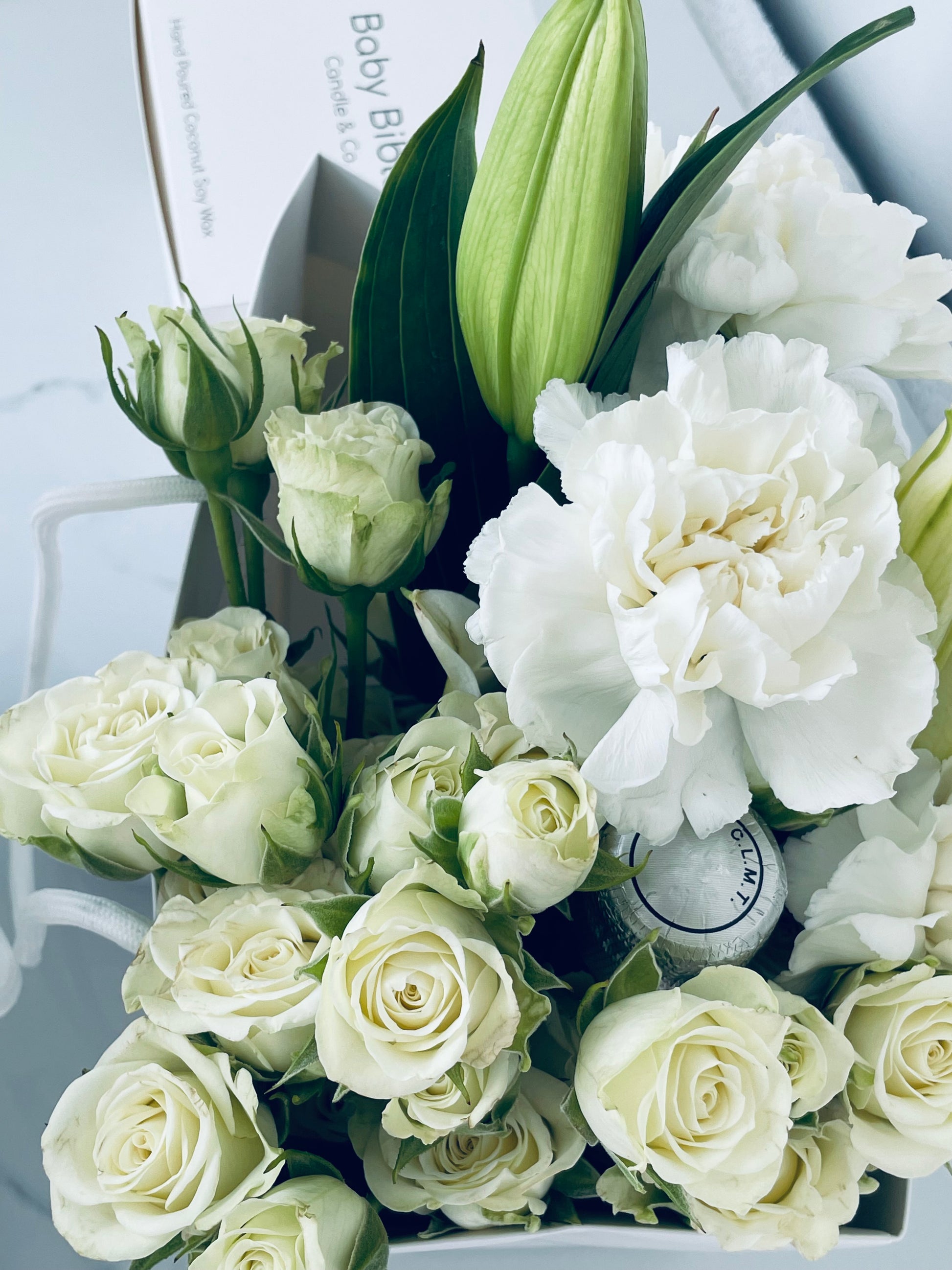 - Fresh white floral arrangement (roses and lisianthus) florals subject to change depending on the seasons.